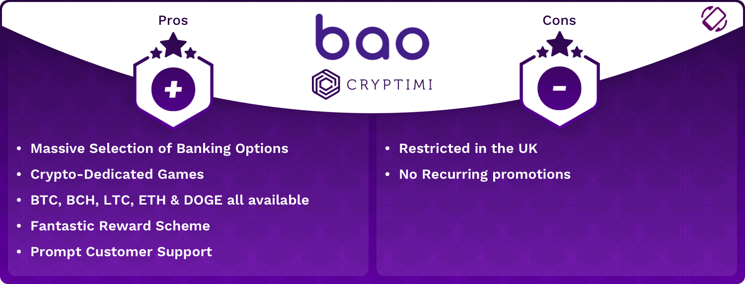 The wagering requirements for Bao’s bonuses vary depending on the particular bonus you’ll be redeeming. For further and more specific information, be sure to consult the bonus T& Cs provided by Bao.