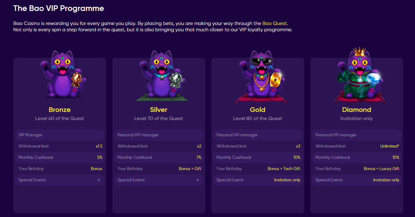 À medida que você avança para os alcances superiores do caminho para os níveis de ouro, você se tornará elegível para o Programa VIP de cassino Bao. Isso começa no nível 60, conhecido como bronze, onde você começará a obter limites mais altos de retirada, reembolso mensal e promoções especiais.