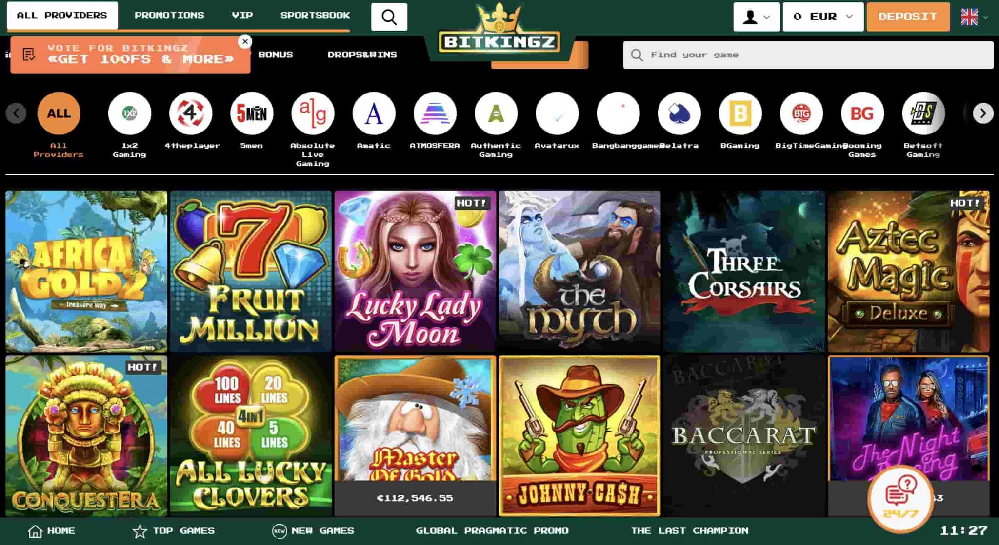 Bitkingz é um online Bitcoin Casino Lançado em 2022 e licenciado em Curaçao. Com mais de 4.000 jogos de cassino e 25 mercados esportivos e esports, a plataforma oferece uma vasta seleção de experiências divertidas e divertidas. Disponível em dispositivos móveis e de computador, o BitKingz foi projetado para ser fácil de usar e intuitivo, especialmente para novos jogadores de cassino.
