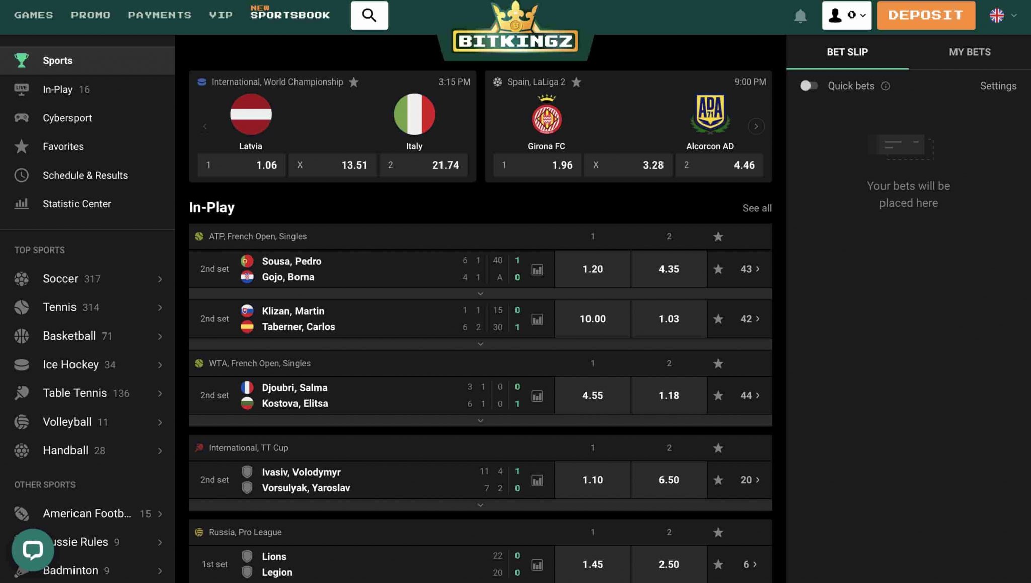 Além de um cassino online bem abastecido e estabelecido, o Bitkingz permite apostar em seus esportes e esports favoritos. O Sportsbook oferece mais de 25 esportes diferentes, com milhares de partidas e eventos a cada ano. Depois de registrar uma nova conta Bitkingz, você pode fazer apostas em seus eventos esportivos favoritos em segundos, usando a interface amigável e intuitiva.