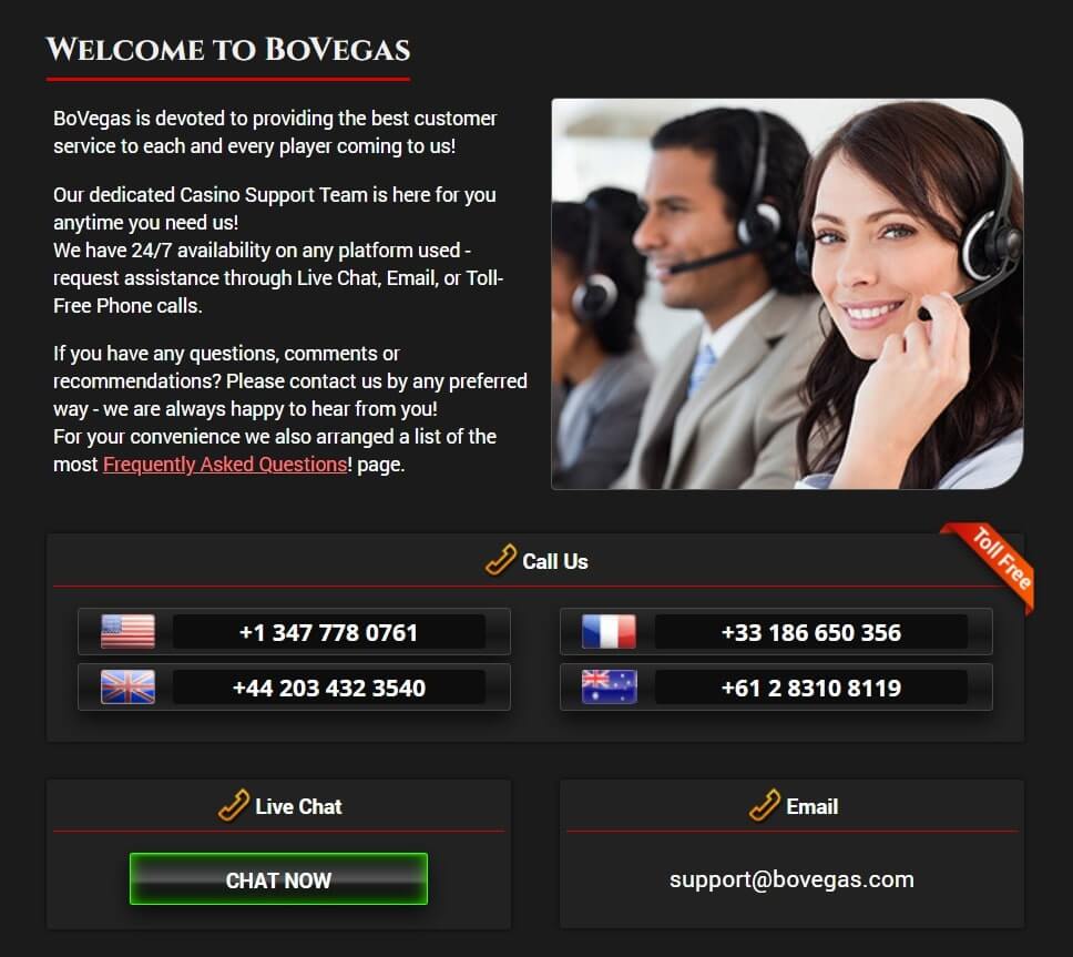 Quando se trata de atendimento ao cliente, Bovegas Brilha intensamente Como oferece praticamente todo meio possível, você poderia pensar: Email, Freephone e chat ao vivo 24/7. É claro que isso é excelente, mas você não precisa que lhe diga isso! Além disso, a equipe de atendimento ao cliente é muito útil e amigável, e a taxa de resposta dos e -mails é bastante rápida.