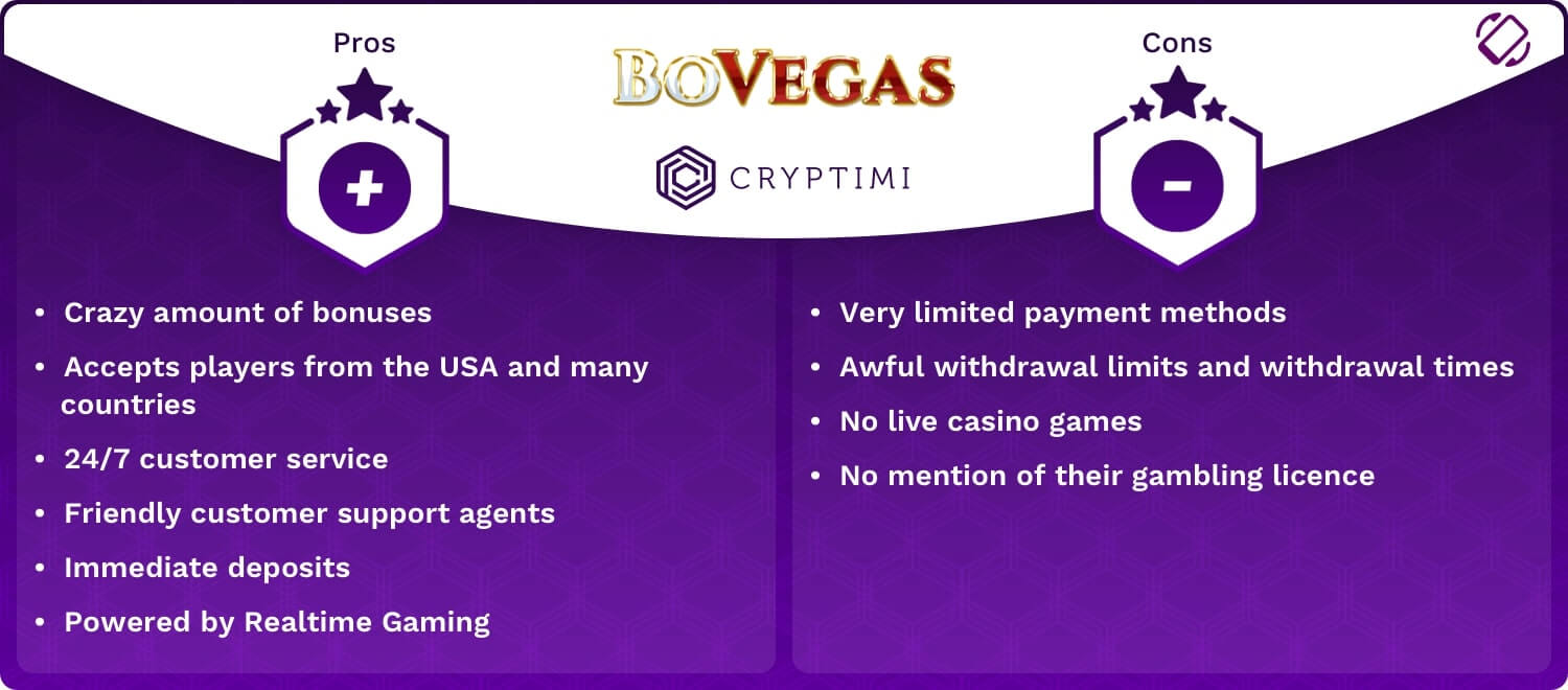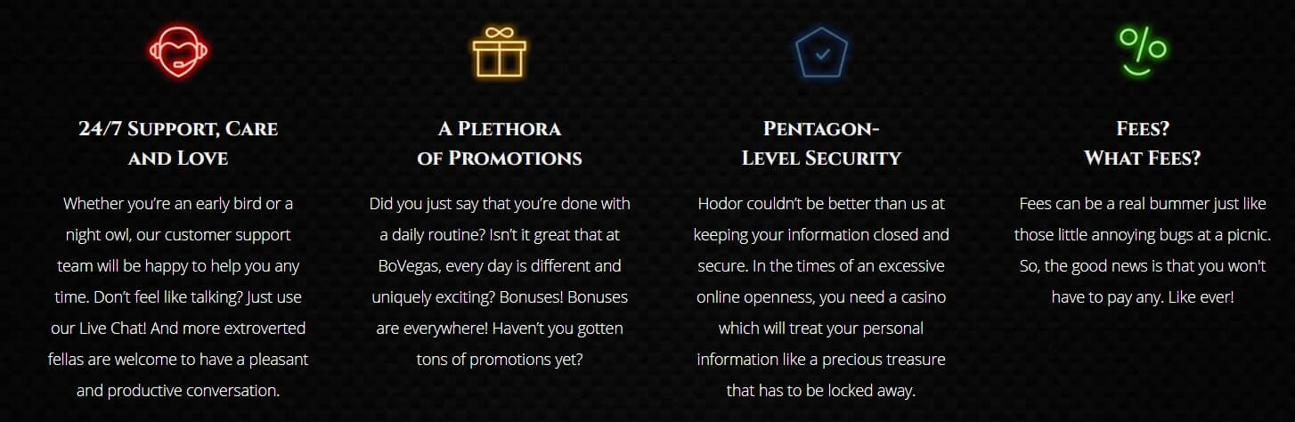 Simplificando, Bovegas é especialista em oferecer seus apostadores toda uma carga de bônus, e isso é, é claro, ótimo. Mas, quando se trata de pagamento, lamentamos dizer que os Bovegas não cumprem o hype que eles evocaram em sua seção de bônus, o que é uma pena. Vamos ver por que juntos, vamos?
