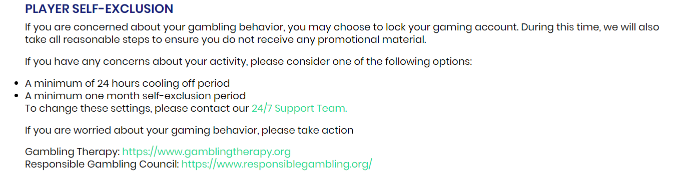 Além disso, eles lembram que os jogadores que os jogos são apenas por diversão e não são um empreendimento lucrativo. Finalmente, eles oferecem 2 medidas de jogo responsáveis: Um período de resfriamento, e um período de auto-exclusão, o que definitivamente será útil se você decidir fazer uma pausa nos jogos. Tudo o que você precisa fazer é entrar em contato com a equipe de suporte ao cliente para implementar essas medidas.