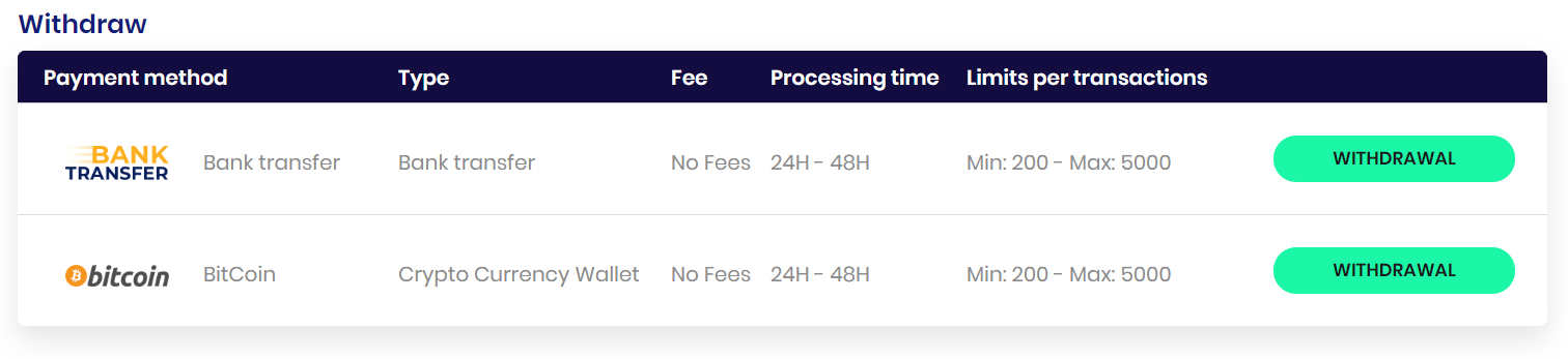 Infelizmente, há uma pitada de más notícias nesta subseção, pois, em oposição à quantidade generosa de bônus de depósito que o Casinobtc nos agraciou graciosamente, Casinobtc Somente suporta 2 métodos de retirada, que é uma grande chatice. No entanto, eles não são métodos de pagamento obscuros, pois você pode dizer: