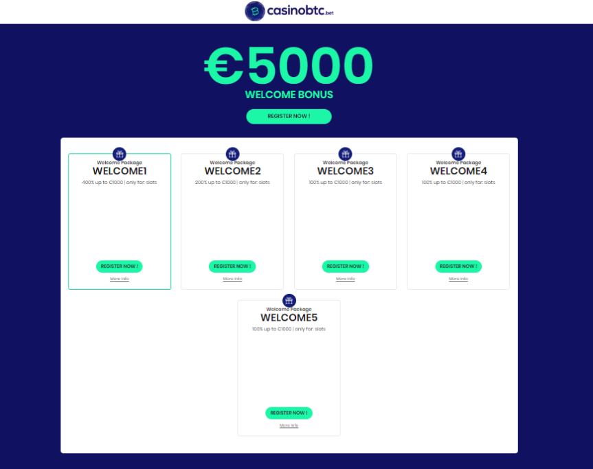 Existe uma maneira melhor de iniciar uma revisão de cassino além de começar com a seção de bônus? Provavelmente não. Então, vamos direto para a carne da questão: o Casinobtc oferece um dos bônus de boas -vindas mais suculentos em que já vimos: oferece não apenas 1, não 2, nem 3, e nem mesmo 4, mas 5 depositam bônus como seus Bem -vindo bônus, isso pode aumentar sua banca para M₿5000.