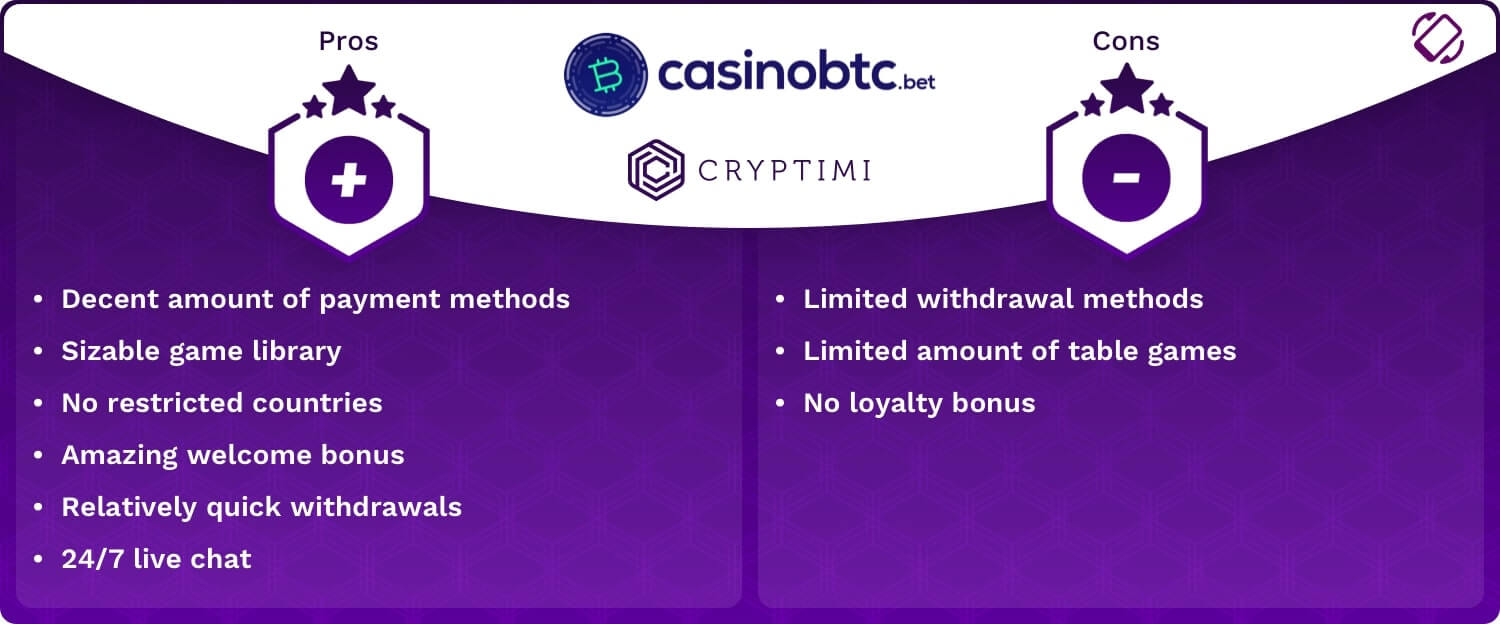 Achamos que, se o Casinobtc começar a apoiar mais métodos de retirada e ajustar seus limites de retirada, eles melhorarão muito sua plataforma. Finalmente, o tempo que leva para que os saques sejam efetuados está entre 24-48 horas, o que não é o mais rápido, mas é muito bom.
