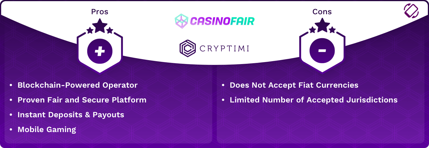 Casinofair é um dos primeiros do gênero, a saber, um operador favorável à blockchain que coloca criptomoeda no centro de sua prática. Sua existência sinaliza um passo importante para fundir o mundo das criptomoedas e o dos jogos online.