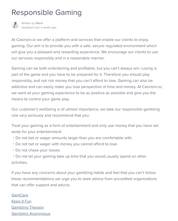 Apesar de permitir que você Mantenha sua identidade escondida Na Casinoin, isso não significa que você não é de ninguém para eles; Na verdade, eles oferecem uma seção inteira de suas perguntas frequentes dedicado a jogos responsáveis, incluindo dicas sobre como abordar o jogo com responsabilidade e os sites de certas entidades que ajudam os jogadores problemáticos.