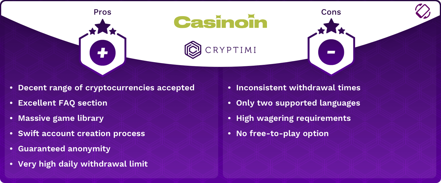 Antes de concluir, uma pergunta final ainda paira grande: o que achamos do cassino? Como todos os outros cassinos por aí, o cassinoia tem seus altos e baixos, mas pensamos que os UPs superam os Downs! Com uma seleção generosa de jogo, uma gama muito decente de criptomoedas suportadas, Altos limites de retirada E um bônus de boas -vindas adorável, você realmente não pode errar com o Casinoin!