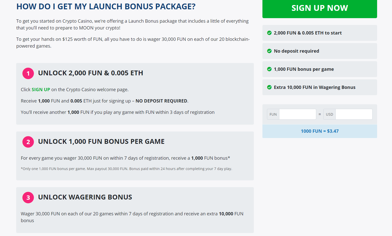 Primeiras coisas primeiro, tudo no Cryptocasino é alimentado por seus criptomoeda proprietária conhecido como "divertido", que faz do Cryptocasino um cassino somente de criptomoeda. Isso é perfeitamente bom para os jogadores que usam criptomoedas dentro e fora de praticamente todos os dias. No entanto, para esses jogadores que estão apenas começando No mundo maravilhoso e maciço das criptomoedas, isso pode ser um pouco problemático, mas não é tão ruim quanto você pode pensar que é.