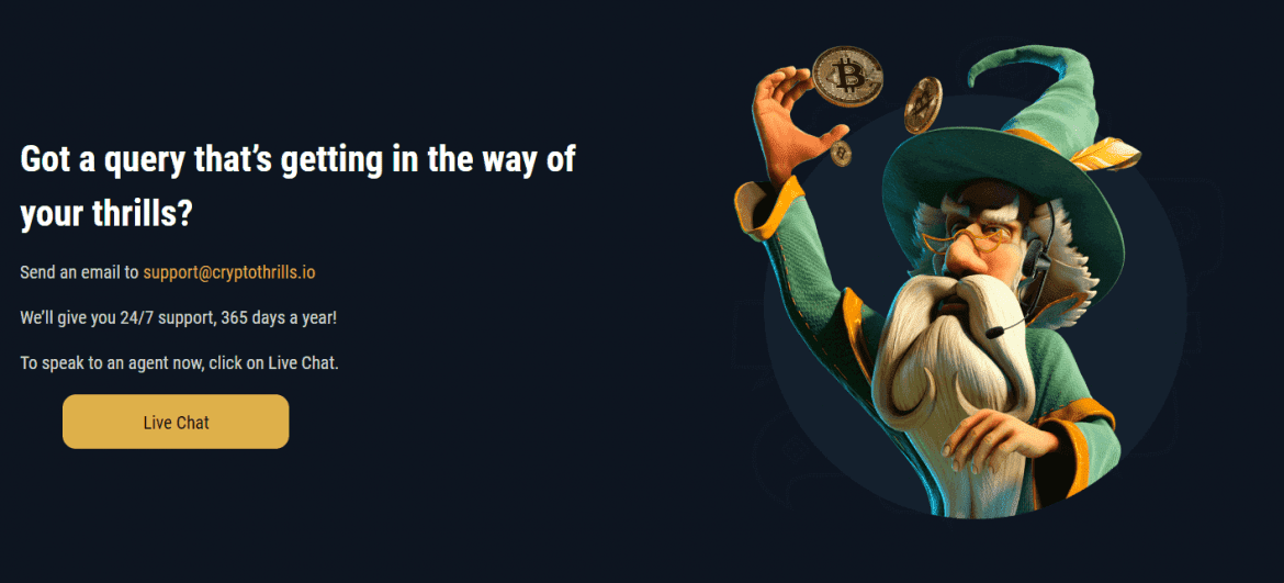 Quando se trata de suporte ao cliente, o CryptoThrills definitivamente fornece os meios adequados para entrar em contato com a equipe de atendimento ao cliente, que está disponível Durante todo o ano 24/7, que são: e -mail e bate -papo ao vivo 24/7. É ótimo ter esses métodos de contato muito necessários, no entanto, alguns jogadores podem não apreciar a falta de um serviço telefônico.