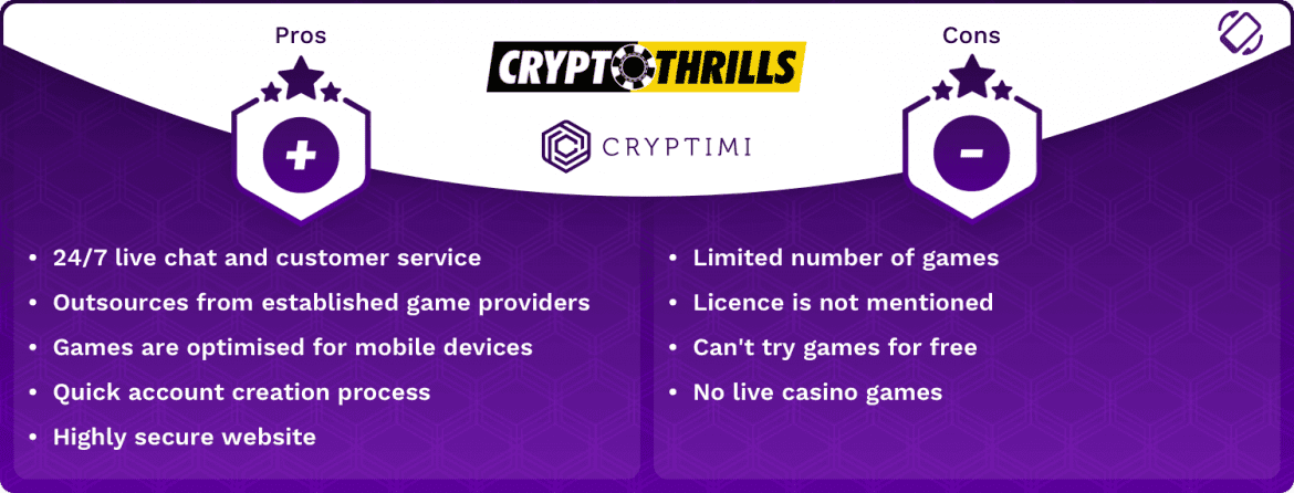 Além disso, esses três métodos de pagamento são criptomoedas, portanto, os jogadores que preferem usar métodos de pagamento convencionais se encontrarão incapazes de efetuar quaisquer depósitos, o que é uma chatice. No entanto, os jogadores que estão acostumados a usar criptomoedas para seus depósitos se sentirão em casa no CryptoThrills.