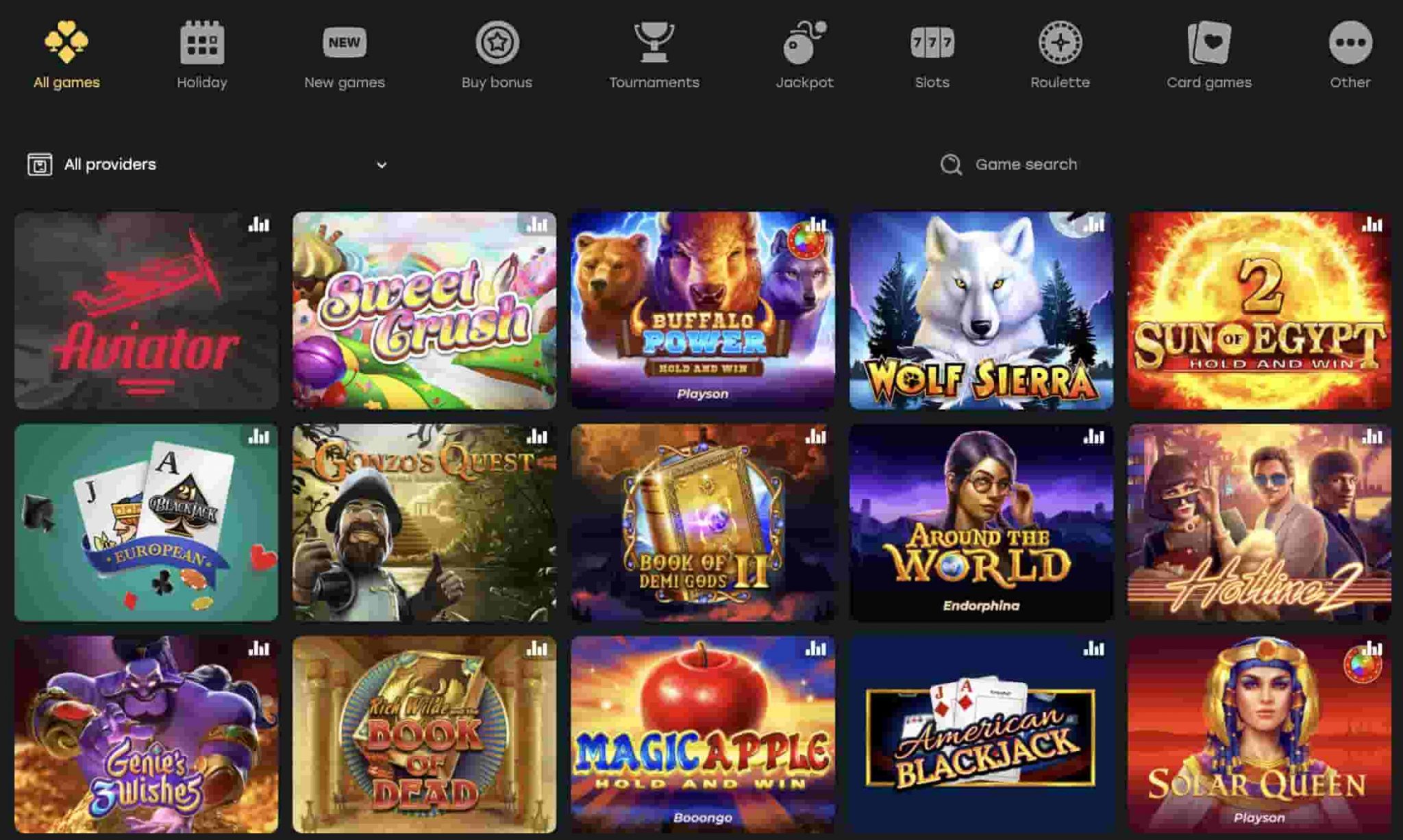 Embora o cassino ofereça muita escolha, ele foi projetado profissionalmente para oferecer uma apresentação limpa e organizada. Você pode navegar facilmente pelas diferentes categorias de jogos usando filtros disponíveis. Isso inclui slots, roletas e jogos de cartas. Você também pode selecionar Compre jogos de bônus O que permite pagar para acionar instantaneamente um bônus de jogo em vez de esperar que ele acionasse aleatoriamente.
