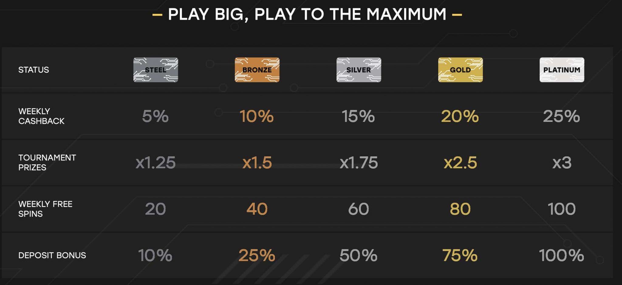 | € 500+ | Bônus de correspondência 100% + 30 rodadas grátis | Bônus de correspondência de 75% + 30 giros grátis | Bônus de correspondência de 75% + 30 giros grátis | 200% de bônus de correspondência + 50 rodadas grátis |
