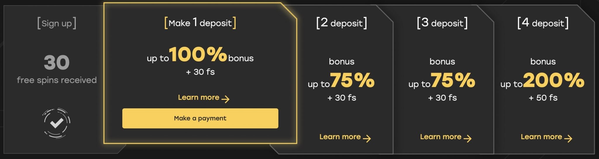 Depois de estar pronto para colocar seu primeiro depósito de dinheiro real, o cassino o recompensará com um bônus de boas-vindas de quatro estágios. A oferta de boas -vindas do Fairspin Casino está dividida da seguinte forma: