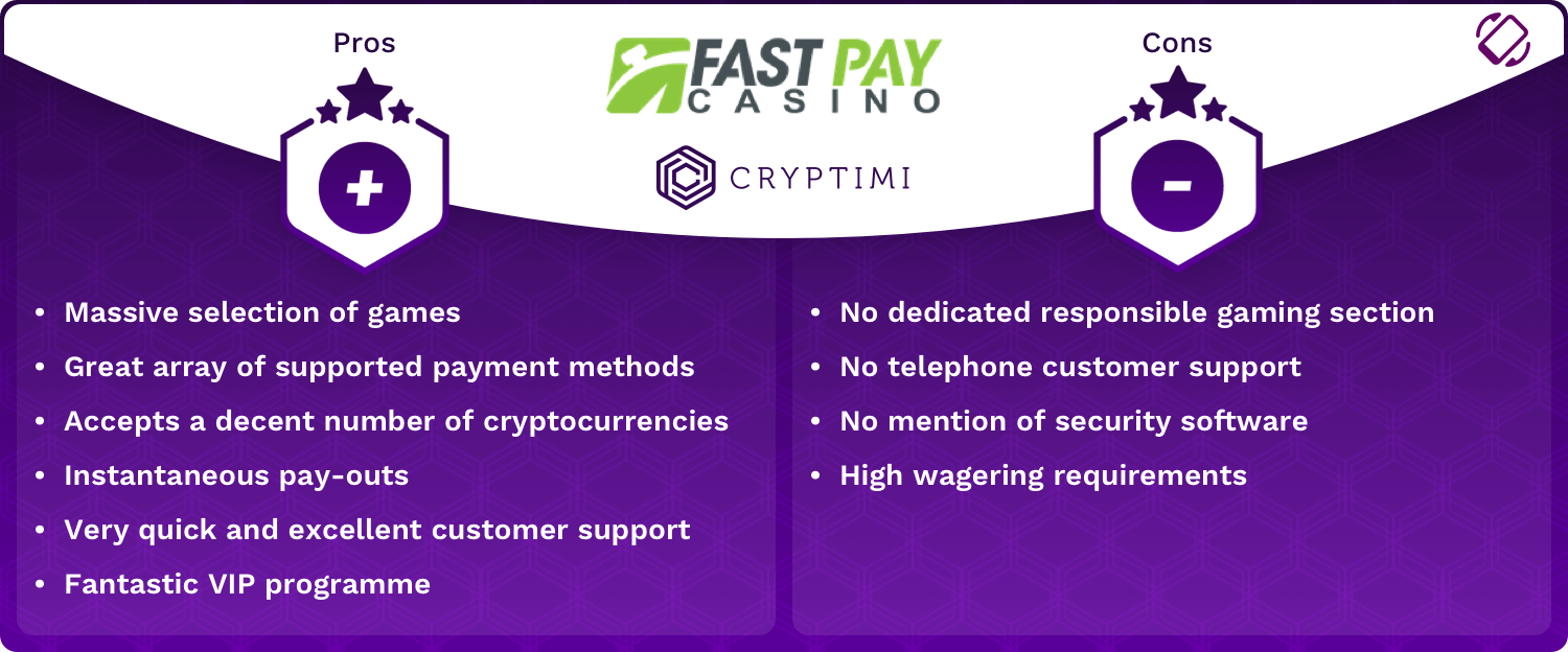 Achamos que o FastPay tem o que é preciso para esmagar a concorrência e emergir como Victor no mundo dos jogos online. Com Uma enorme seleção de jogos de primeira linha, mais métodos de pagamento suportados do que a maioria dos apostadores já ouviu falar, pagamentos instantâneos, suporte rápido ao cliente e o fato de que eles apoiam criptomoedas, jogar no FastPay deve realmente ser um acéfalo!