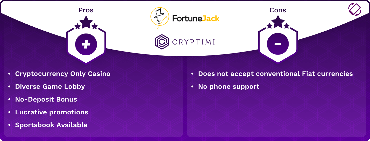 Como mencionado anteriormente, o Fortunejack se destaca da maioria dos outros cassinos online no mercado desde Aceita apenas pagamentos em moedas digitais em vez de métodos de pagamento tradicionais, como cartões de crédito ou transferência bancária. Isso pode ser uma bênção e uma maldição, dependendo de como você olha, mas vendo como criptomoedas estão se tornando cada vez mais populares E possui vários benefícios, definitivamente diríamos que os profissionais superam os contras!