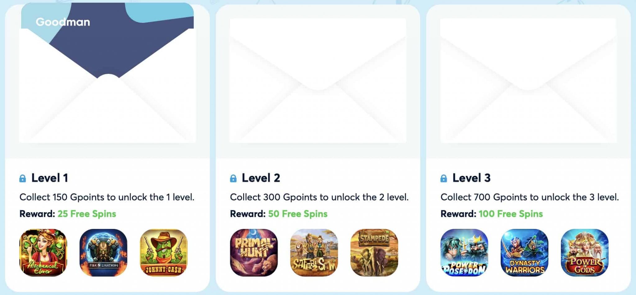 Os jogadores que gostam de receber ainda mais recompensas devem considerar ingressar no Goodman Casino VIP Club. Este clube de 14 níveis oferece presentes cada vez mais valiosos e outras surpresas. Para participar, tudo o que você precisa fazer é colocar apostas reais em dinheiro. Por A cada € 10 apostada, você receberá 1 GPOint. A entrada no clube exige 150 GPoints e recompensa você com 25 rodadas gratuitas em uma seleção de slots de vídeo. As recompensas de ingressar na maioria dos níveis são mostradas, os prêmios por serem um membro do clube de nível superior são desconhecidos. É provável que estes rolos altos são fornecidos com gerentes de conta dedicados, Pacotes de recompensa personalizados e suporte avançado de retirada.