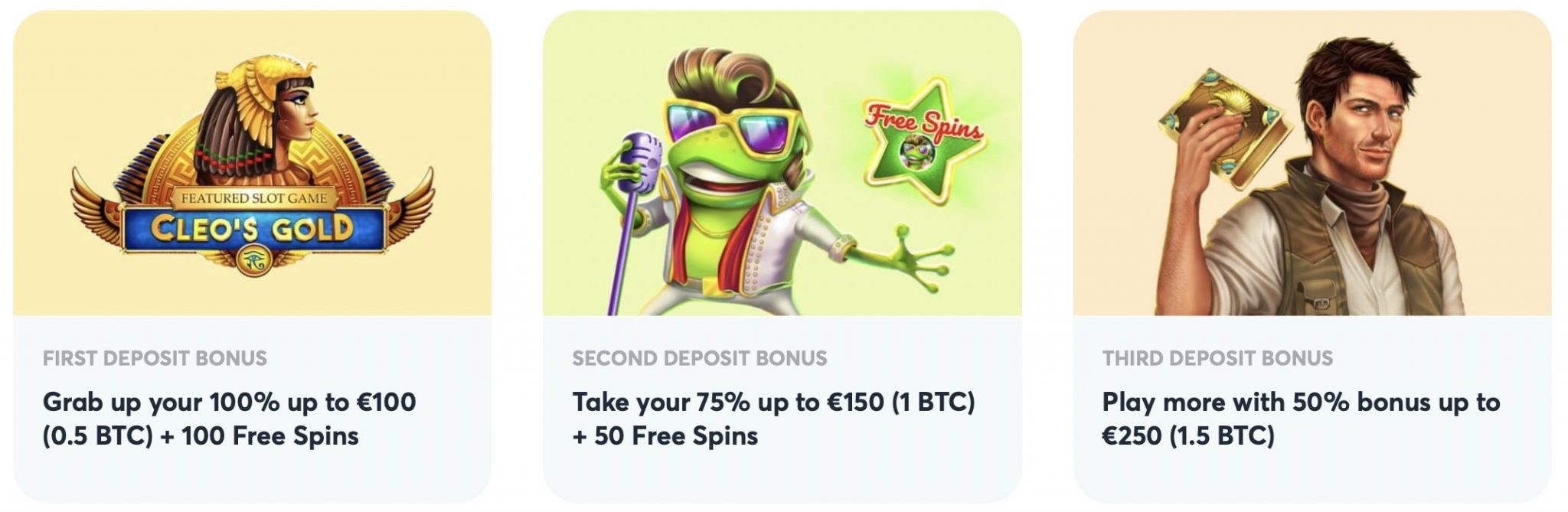- Depósito 1: Obtenha um bônus de depósito de correspondência de 100% até 0,5BTC + 100 rodadas grátis.