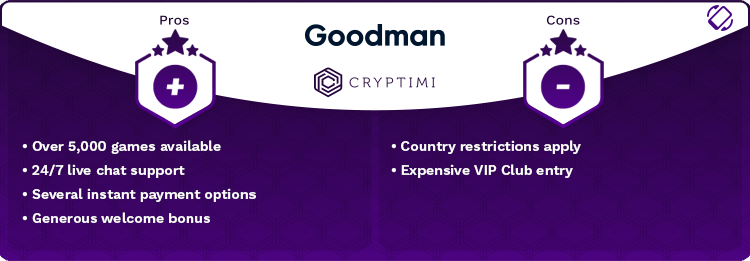 Goodman é um cassino bitcoin online que foi criado em 2022. É de propriedade da Dama N.V. um operador de cassino experiente que se baseia e licenciado em Curaçao. O cassino oferece um dos maiores números de jogos e suporta uma seleção igualmente grande de métodos de pagamento tradicionais e de criptomoeda.