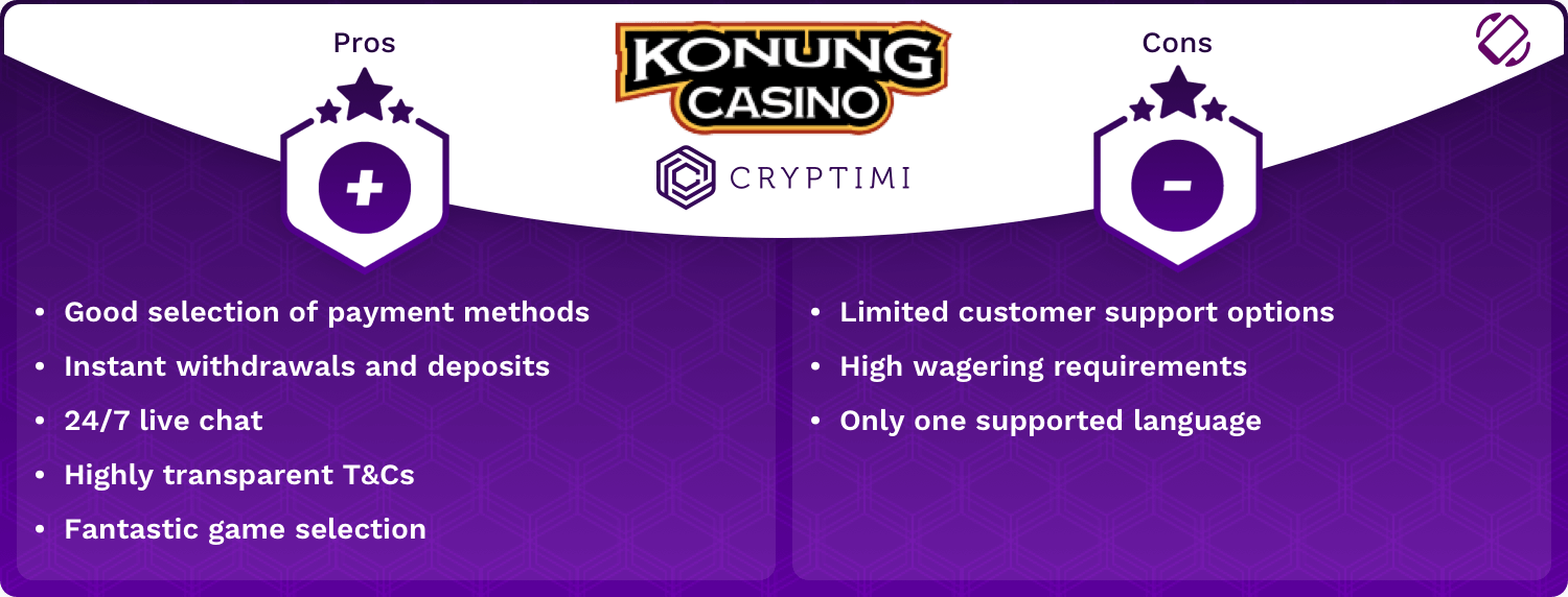 Bem, o que achamos de Konung? Nós tivemos Muitas coisas boas Dizer sobre esse cassino e isso é porque eles oferecem muitas coisas que vale a pena experimentar este cassino! Dificilmente descobrimos nada de dizer sobre Konung, o que mostra que eles sabem o que estão fazendo muito bem. Então, o que você está esperando? Há um local vazio no Konung Casino com seu nome!