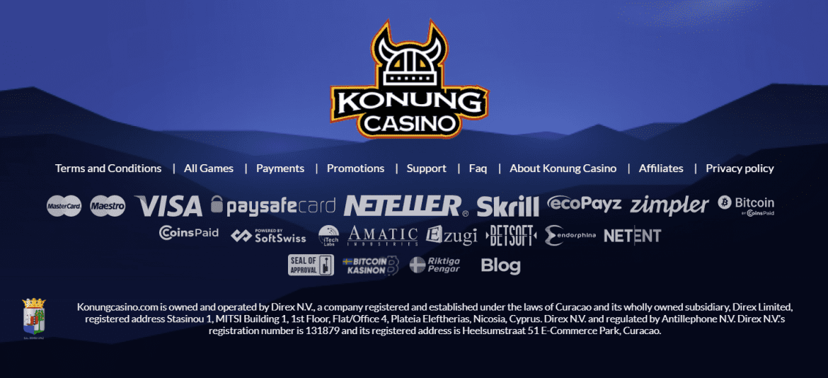 Konung é de propriedade da Direx N.V., que é Licenciado pelo Governo de Curaçao, o que obviamente significa que a autoridade de jogo de Curaçao regula esse cassino. A má notícia, no entanto, é que Konung não parece ter uma seção dedicada aos jogos responsáveis. No entanto, Konung afirma que oferece Proteção extensa do jogador Para jogos responsáveis, talvez essas informações estejam disponíveis apenas para jogadores que registraram uma conta no Konung.