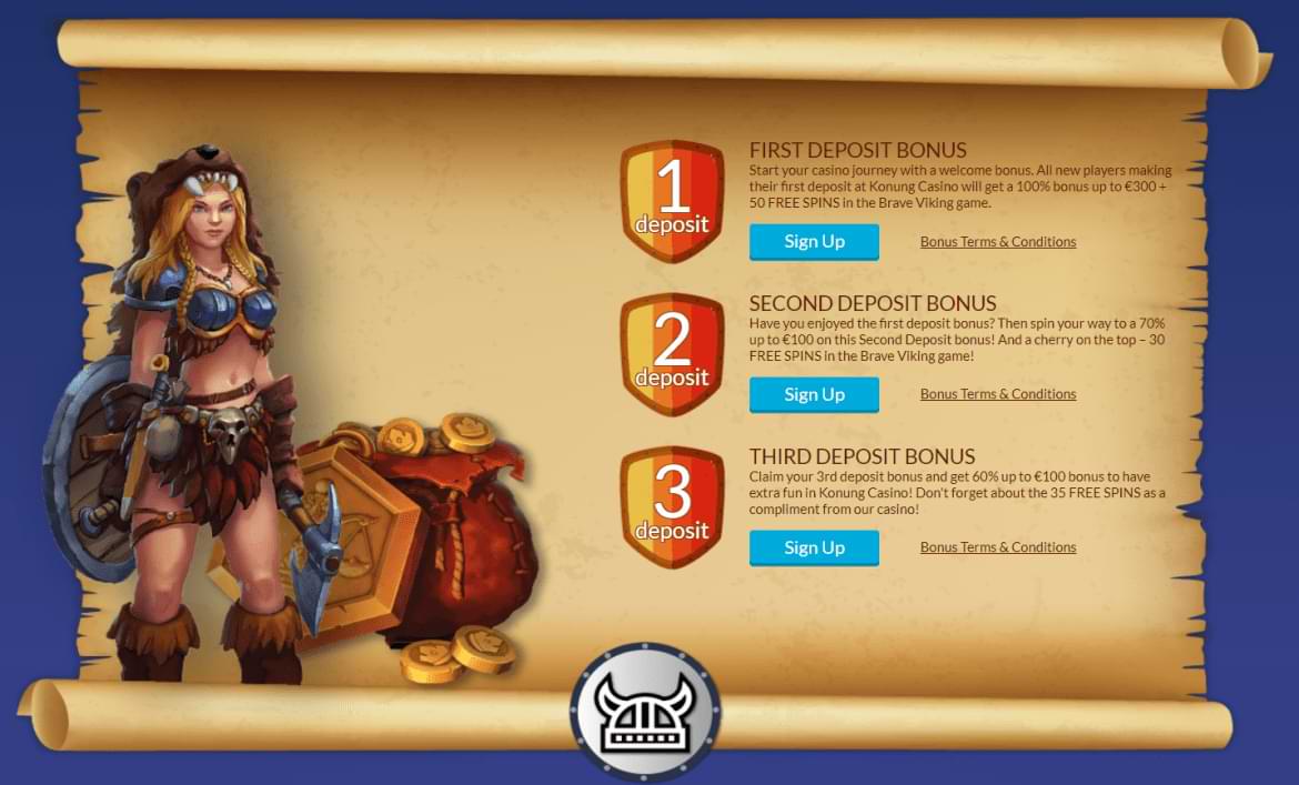 Se algum de vocês, apostadores, precisarem convencer a jogar no cassino, Konung oferece na forma de Um incrível bônus de boas-vindas de três partes! Seu bônus de boas -vindas consiste nos seguintes bônus: