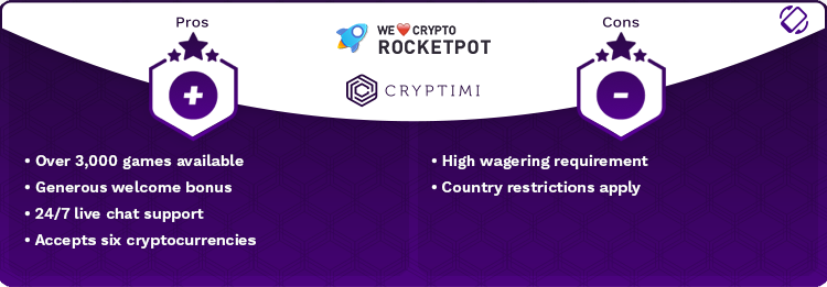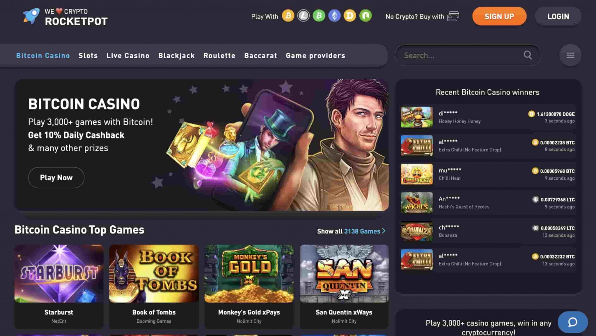 Rocketpot é um cassino bitcoin online lançado em 2022 e é Licenciado pelo Governo de Curaçao. A plataforma oferece milhares de jogos de cassino ao lado de uma variedade de mercados esportivos. Criado para apoiar o Bitcoin e outras criptomoedas, o Rocketpot não aceita moedas fiduciárias. Como resultado, o cassino é capaz de oferecer um generoso bônus de boas -vindas e promoções em andamento.