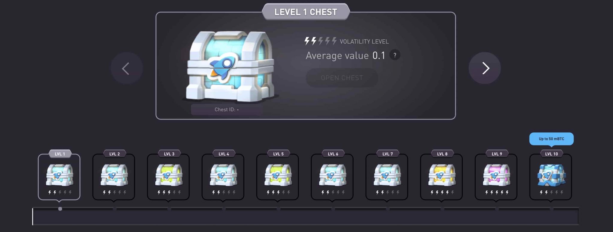 O Rocketpot Casino recompensa todos os seus jogadores com pontos de experiência. Você pode Ganhe esses pontos toda vez que você coloca uma aposta de dinheiro real, com jogos diferentes o recompensando de uma maneira diferente. Depois de ter pontos suficientes, você pode abrir o primeiro baú e girar a roda para determinar seu prêmio. Todo peito tem um prêmio garantido do MBTC, mas seu valor é determinado pelo giro da roda.