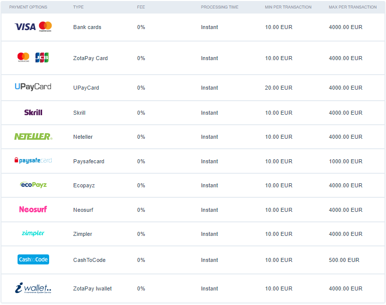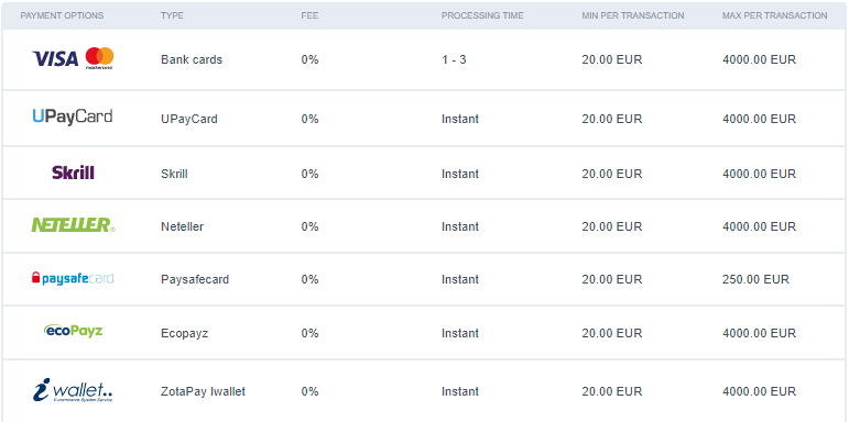 Quando se trata de saques, você tem um pouco menos de opções, com 9 no total. A maioria deles verá os saques processados instantaneamente, mas os retiradas de cartão de crédito podem levar até 3 dias. Como nos depósitos, os saques não têm taxa extra, com números mínimos de transações conforme definido para depósitos, variando de US € 20 a US € 4000.