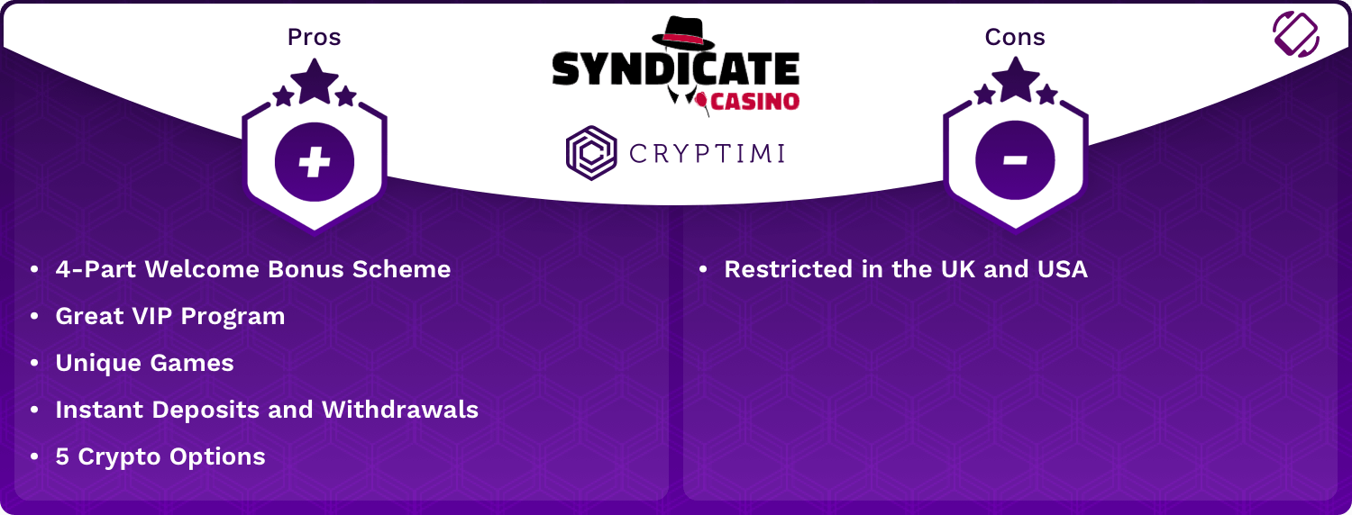 O Syndicate fornece aos jogadores tudo, desde um cassino moderno a uma ampla gama de métodos de pagamento, incluindo 5 principais opções de criptomoeda. E isso não é tudo, também há uma ótima seleção de jogos e serviços que incluem jogos de criptografia da gigante da indústria, B-Gaming. Mas há de fato muito mais para atraí -lo, o que se tornará aparente ao longo desta revisão.