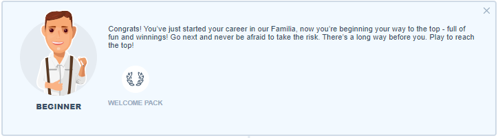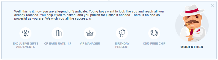A cada classificação, você será recompensado entre 10 a 100 rodadas gratuitas. Então, você passará para o topo da árvore e se tornará um chefe, Don e, finalmente, um padrinho, onde você receberá um € 50, € 100 e € 250 chip grátis respectivamente como uma recompensa.