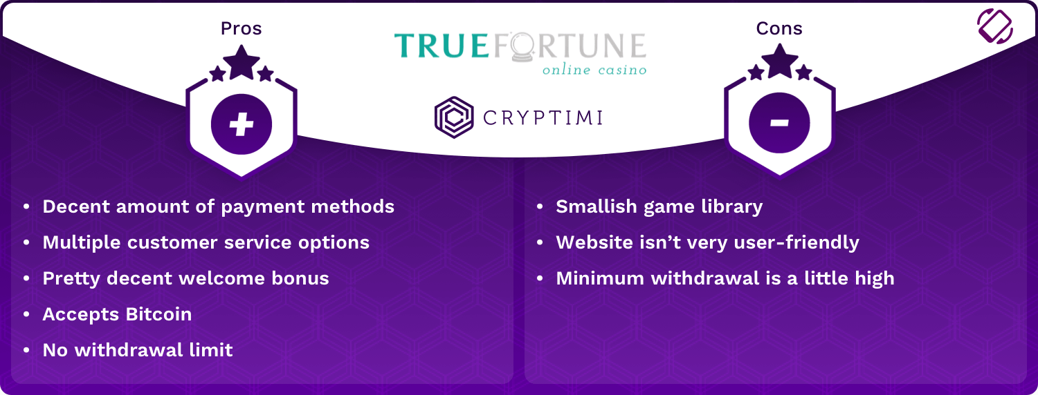 Em suma, a True Fortune oferece um pacote bastante decente como uma plataforma on -line, mas há espaço para melhorias. Os bônus em oferta são bastante decentes, as opções de atendimento ao cliente são ótimas e a gama de métodos de pagamento é satisfatória. No entanto, o design do site precisa de uma atualização desesperada e certas seções devem definitivamente ser mais informativo.