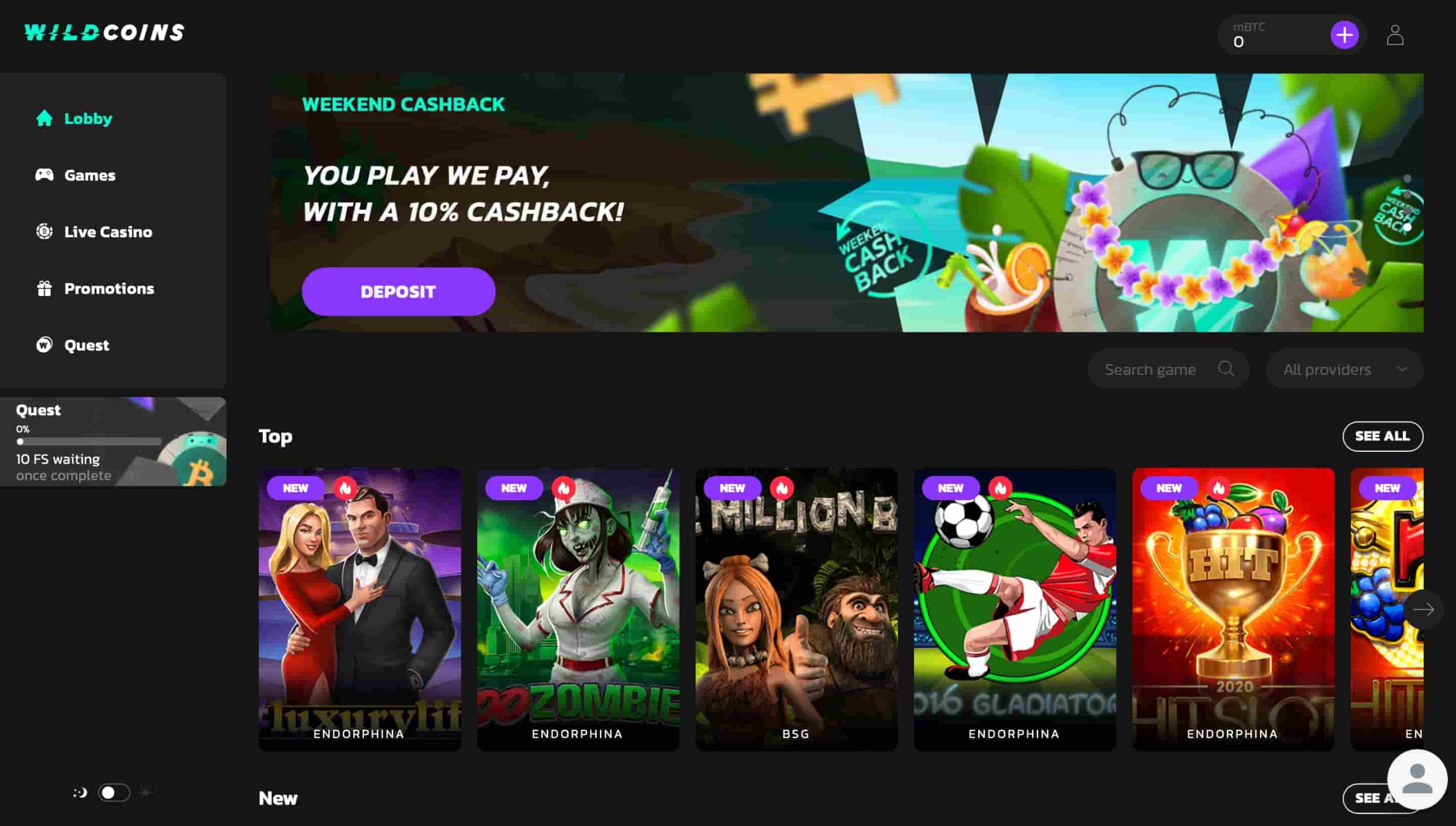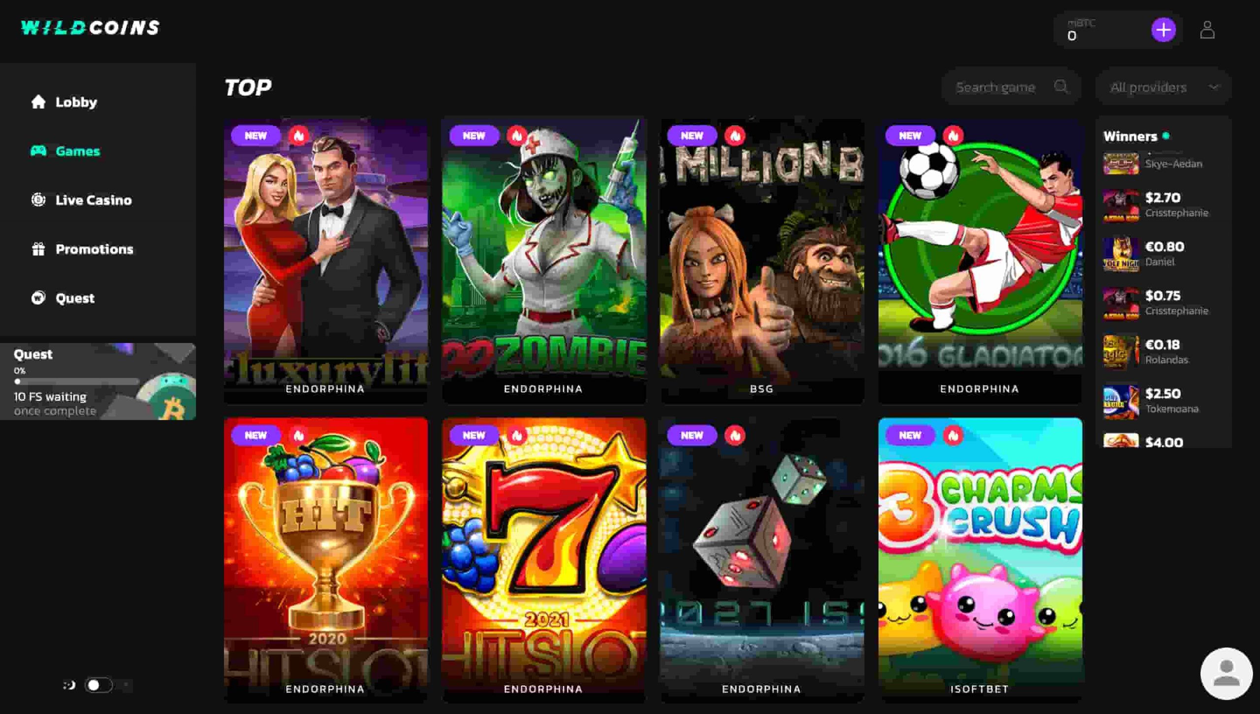 Wildcoins é um cassino de bitcoin que só aceita depósitos e retiradas por meio de criptomoeda. Como resultado, Você não pode financiar sua conta usando moedas fiduciárias, como EUR ou USD.