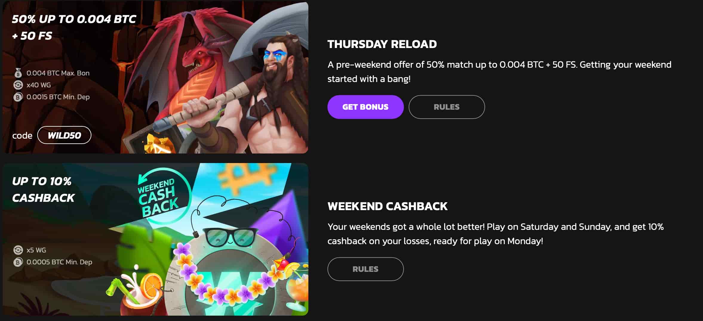 - Quinta -feira recarregue: Obtenha um bônus de correspondência de 50% no valor de 0,004 BTC + 50 rodadas grátis.