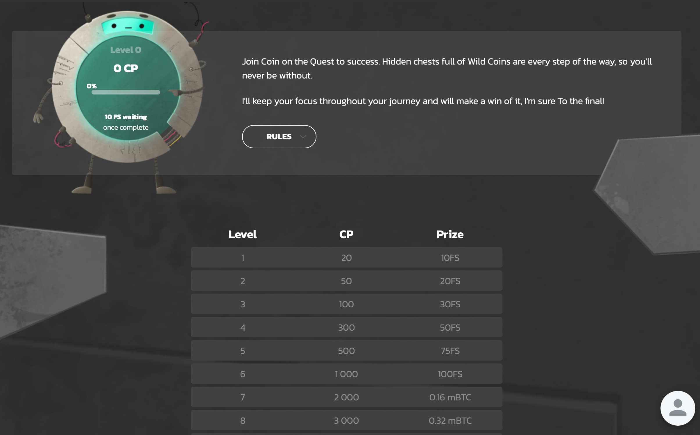 As recompensas em Wildcoins continuam chegando, desta vez na forma de missões. Depois de registrar uma conta, você será automaticamente inscrito no clube VIP do cassino. Toda aposta em dinheiro real que você coloca se traduzirá em pontos. O padrão A taxa de conversão é de 1 cp para cada 0,00025 BTC apostado em slots.