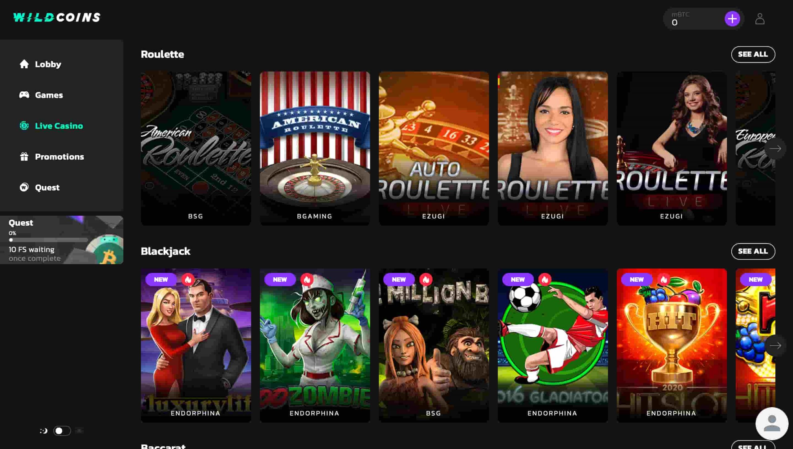 O Wildcoins Live Casino oferece um catálogo igualmente atraente de títulos. Com uma conta registrada, você poderá tocar no Blackjack, Roleta, Baccarat e outras mesas populares. Ao contrário da coleção virtual do cassino, Jogos ao vivo só podem ser jogados com dinheiro real.