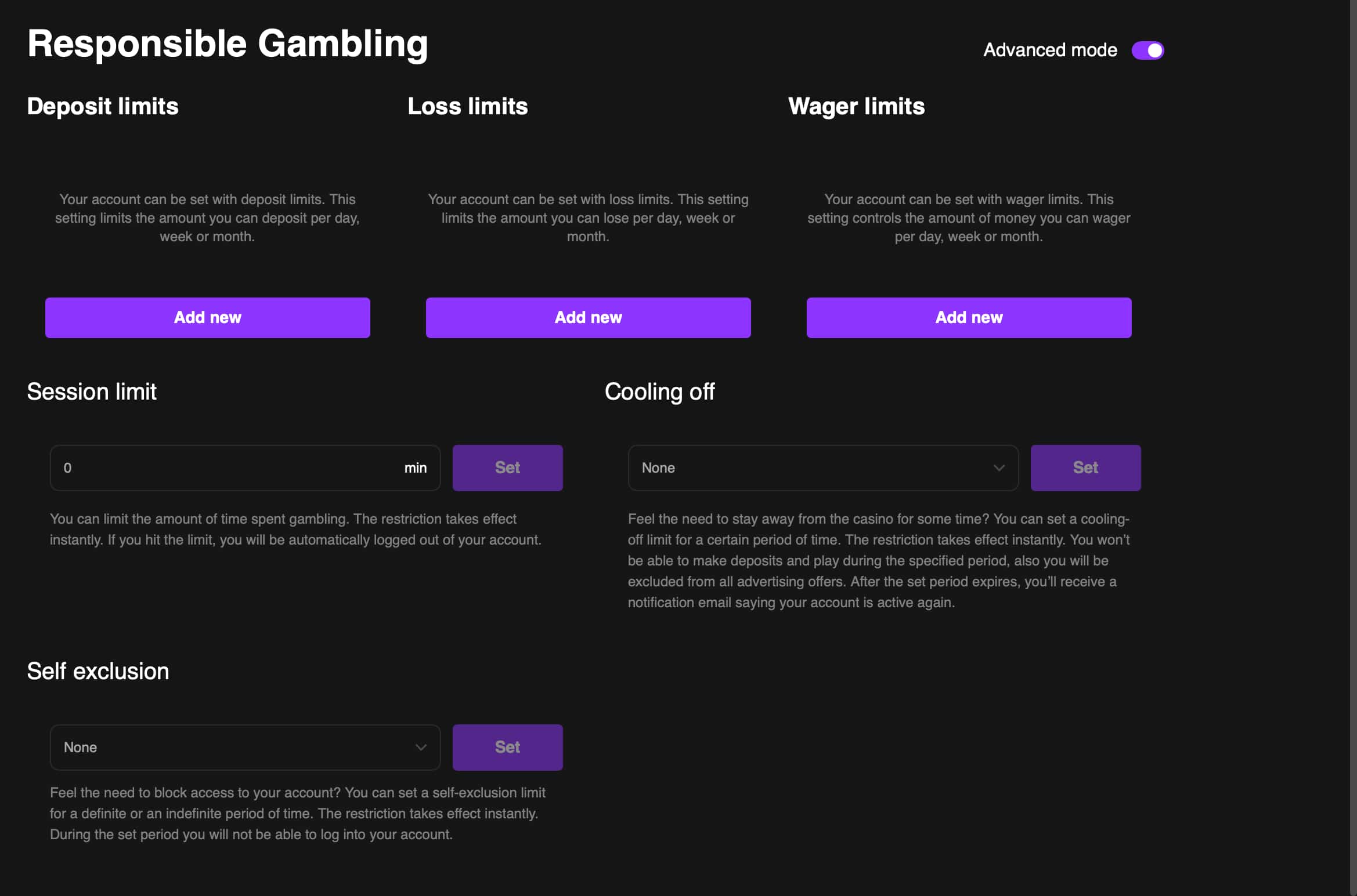 Os limites acima pode ser definido pelo usuário sem precisar falar com um representante de atendimento ao cliente. Você também pode escolher a opção de auto-exclusão se quiser fazer uma pausa mais longa.