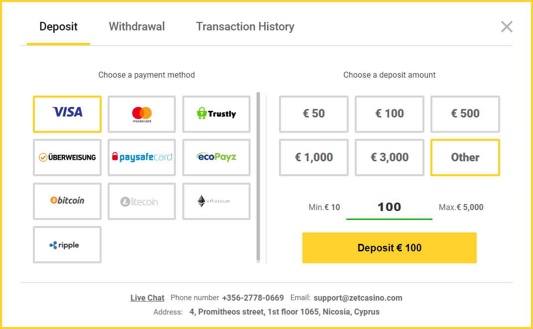 Seguindo em frente, Zetcasino aceita apenas depósitos de um mínimo de € 10 (ou a quantidade equivalente nas moedas que aceita); No entanto, não está claro se eles impõem um valor máximo de depósito e parece provável que não o façam. Finalmente, a maioria dos métodos de depósito é creditada instantaneamente, exceto por cartões de crédito devido a tempos de processamento.