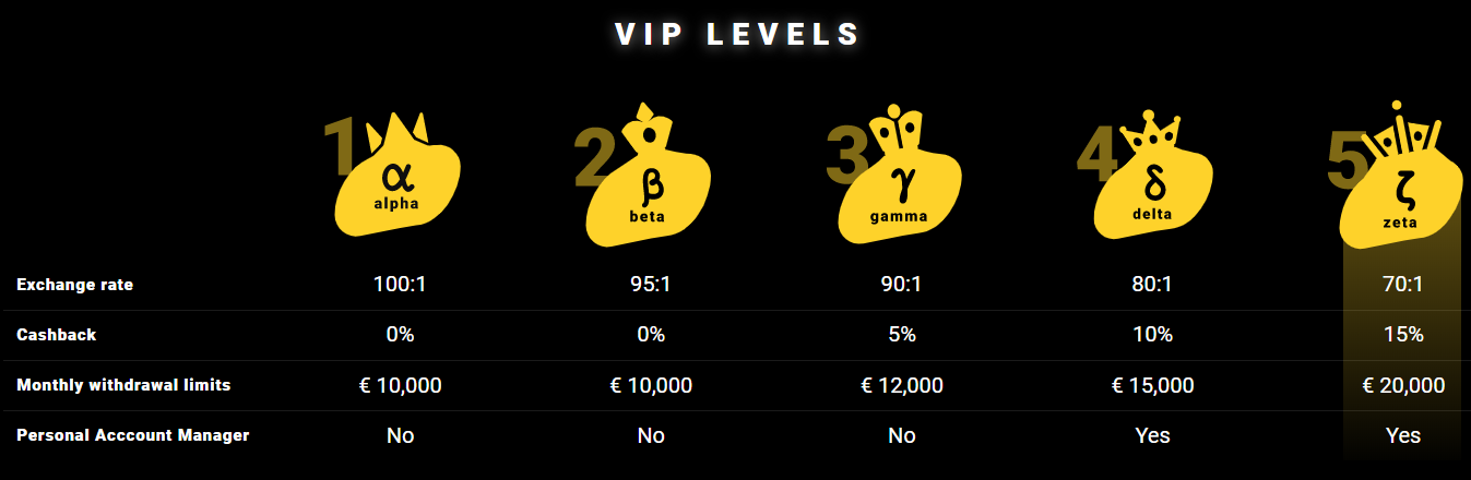 Além dos diferentes limites mensais de retirada, os 5 níveis VIP do Zetcasino também oferecem taxas de câmbio variadas, porcentagens de reembolso e a opção de fazer uso de um gerente de contas pessoais. Os diferentes benefícios podem ser vistos abaixo: