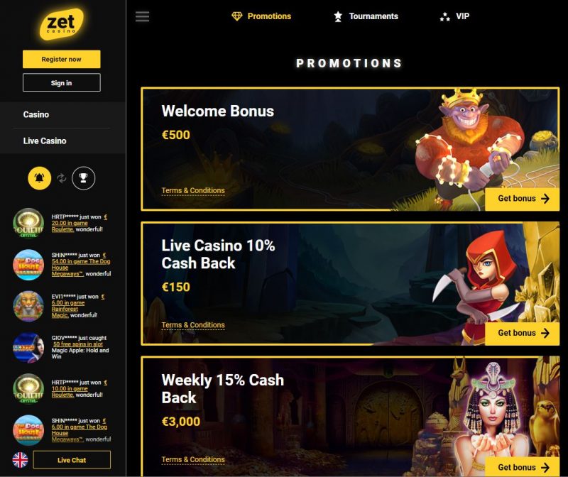Se um cassino quer começar a convencer os jogadores a passar o tempo jogando nele, ele deve começar atraindo esses jogadores com um bônus de inscrição acolhedora; Felizmente, Zetcasino entrega um oferta de boas -vindas bastante tentador. A oferta é simples: se você depositar € 20 (ou 80 polonês Złoty, 200 kroner norueguês, 6.000 húngaros forint, 1.200 rublos russos ou 30 dólares portuguêss), você receberá: