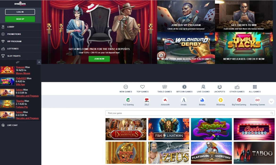 Registrado em Curaçao, o Syndicate Casino é um cassino seguro e respeitável que permite que você Use fiat e criptomoedas. Apoiando pagamentos por meio de cartão de crédito, ewallets, vouchers de pagamento e outros, o cassino permite configurar uma nova conta e começar a reproduzir em minutos.