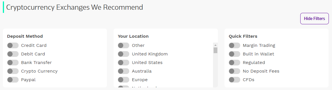 Além disso, você pode usar nosso sistema de filtragem avançado para personalizar os resultados de acordo com o método de depósito preferido, o país e os recursos desejados. Nosso sistema calculará todos os meandros e a troca apresentada no topo provavelmente será a melhor troca de negociação de criptografia para você.