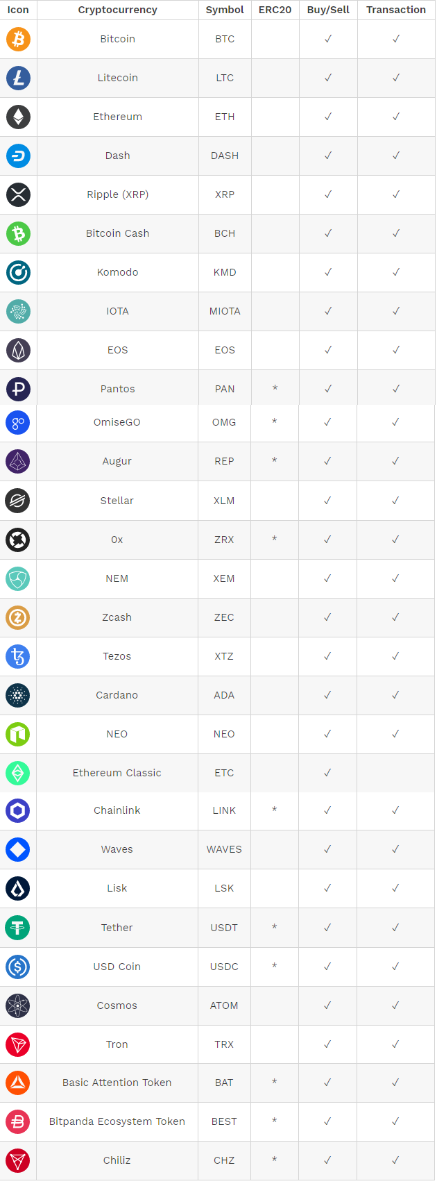Mesmo que o Bitpanda não liste centenas de altcoins ou todos os tokens ERC20 em sua plataforma, ele permite que os usuários Comprar, Assim, umassim, Assim, vender ou negociar as principais criptomoedas, incluindo o abaixo: