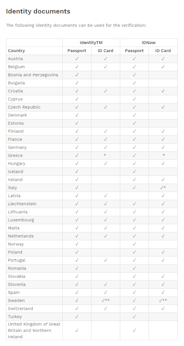 Para verificar a identidade, você precisa fazer upload de documentos de identificação. Fazer isso permitirá que você compre, venda ou trocasse criptomoedas no Bitpanda. Os documentos necessários variam Dependendo do seu país de residência De acordo com o gráfico mais abaixo nesta revisão do Bitpanda. Depois que todos os documentos estiverem prontos, você poderá escolher qualquer um dos dois fornecedores (IdentityTM, IDNOW) para concluir uma identificação baseada em vídeo.