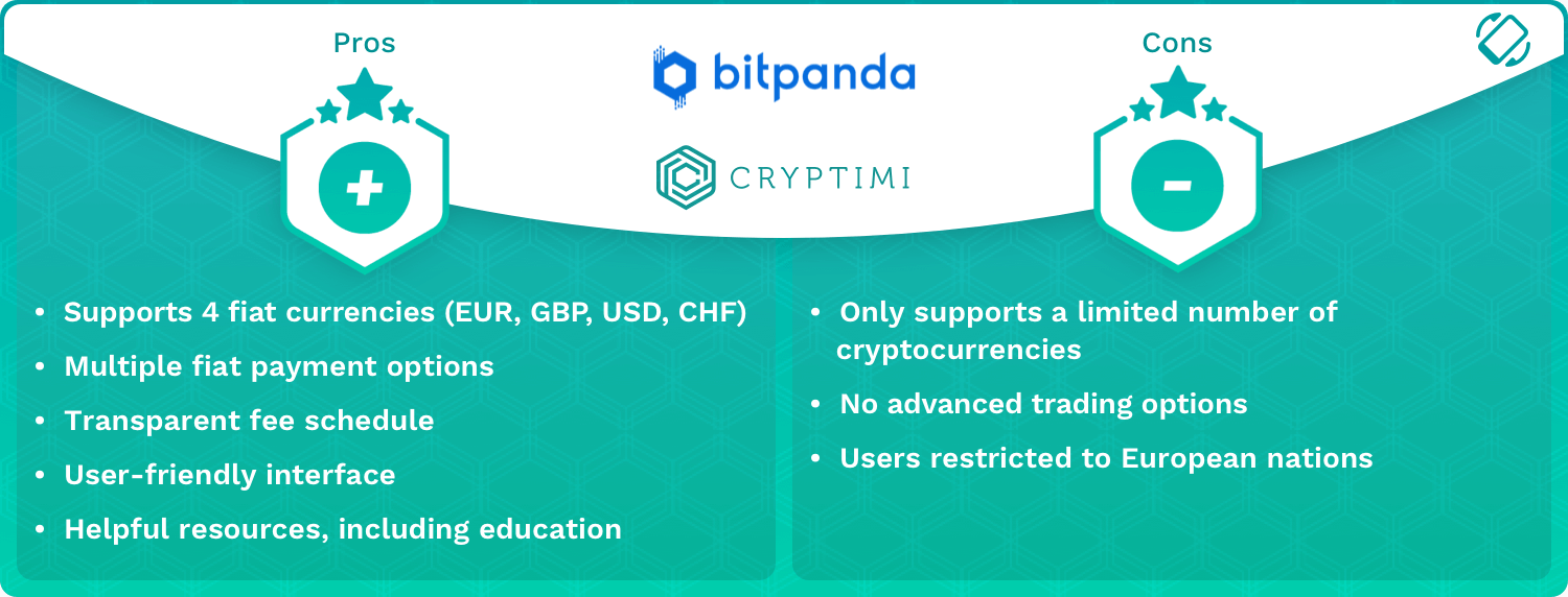 A melhor coisa sobre o Bitpanda é que ele suporta um Ampla gama de métodos de pagamento Usando 4 moedas fiduciárias diferentes, para comprar ou vender rapidamente criptomoedas. Oferece recursos básicos de segurança como 2FA e Pinning IP para proteger a conta do usuário do acesso não autorizado. Mesmo que não suponha métodos de negociação avançados como Negociação de margem, ainda é uma boa opção para comerciantes iniciantes.