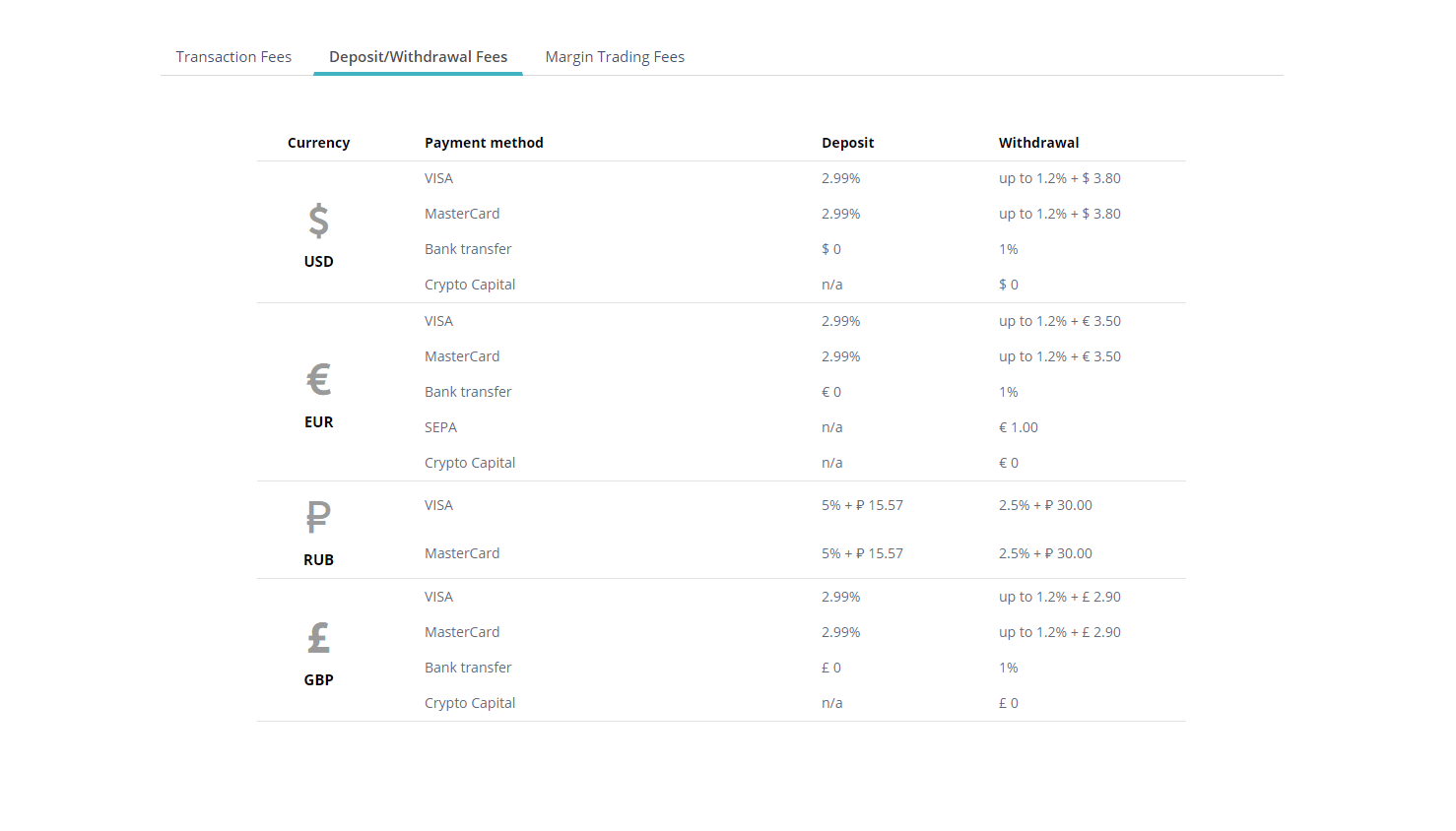 As taxas de depósito e retirada no Cex.io variam com base na moeda fiduciária e nos métodos de pagamento conforme indicado abaixo: