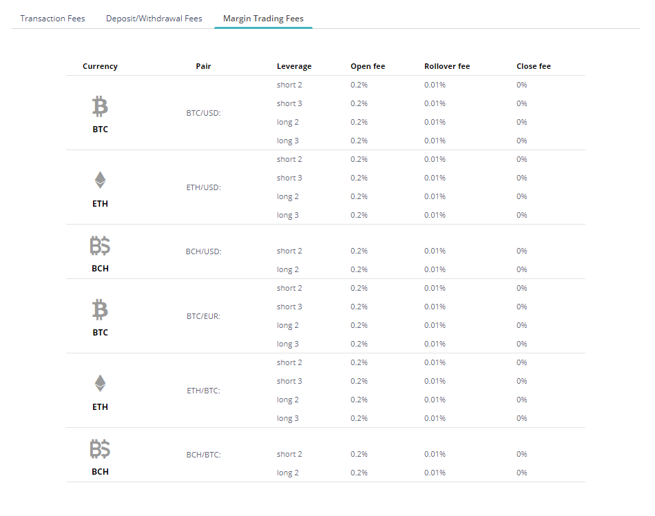 As taxas de negociação de margem têm um 0.2% Taxa aberta, um 0.01% Taxa de capotagem e um 0% Taxa próxima para todos os pares. Mais informações podem ser encontradas abaixo: