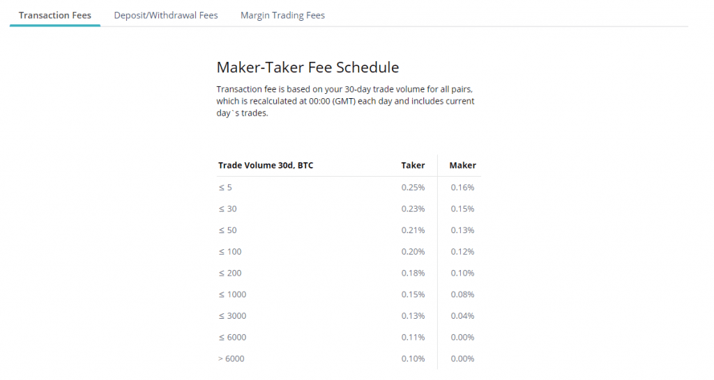 Cex.io Exchange funciona no modelo Maker/Taker e no As taxas de transação variam com base no seu volume mensal de negociação. Para o tomador, começa em 0.25% Para um volume comercial de 30 dias inferiores a 5 BTC. Esta taxa pode ser tão baixa quanto 0.1% Quando os volumes de negociação são superiores a 6.000 BTC. Para o fabrica 0% Para volumes de negociação maiores que 6.000 BTC. Se você quiser saber mais sobre as taxas de transação, pode consultar a tabela a seguir: