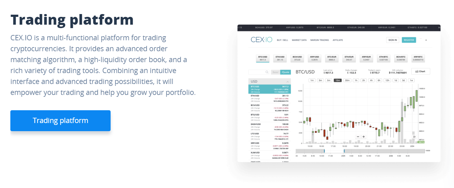 Usuários experientes que procuram um Descontagem à taxa de negociação e aumento das funcionalidades pode optar por usar a plataforma Cex.io. A plataforma inclui uma variedade de ferramentas, incluindo a definição de pedidos de mercado e várias APIs.
